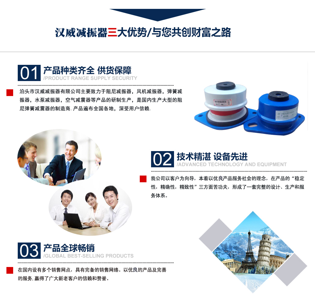 ?泊頭市漢威減振器有限公司主要致力于阻尼減振器,風(fēng)機(jī)減振器,彈簧減振器,水泵減振器,空氣減震器等產(chǎn)品的研制生產(chǎn),是國(guó)內(nèi)生產(chǎn)阻尼彈簧減震器的制造商,產(chǎn)品廣泛用于中央空調(diào)、通風(fēng)管道、鋼鐵、發(fā)電、石化、水泥和城市供熱等行業(yè)的各類管道和設(shè)備上,并在全國(guó)多地工程上得到應(yīng)用,業(yè)績(jī)遍布全國(guó)多地,深受用戶信賴. 公司主要減振器系列產(chǎn)品有:中央空調(diào)系列減振器、泵房系列減振器、管道系列減振器、風(fēng)機(jī)系列減振器、以及自行設(shè)計(jì)制作的系列隔振臺(tái)座。泊頭市漢威減震器科技有限公司擁有多名高素質(zhì)技術(shù)人員,擁有完善的阻尼彈簧減震器生產(chǎn)和檢驗(yàn)專用設(shè)備,擁有硅橡膠自動(dòng)擠出生產(chǎn)線,全自動(dòng)彈簧機(jī)等設(shè)備。生產(chǎn)條件逐漸完善進(jìn)步,努力擴(kuò)大生產(chǎn)規(guī)模,提高泊頭市減震器科技有限公司的生產(chǎn)競(jìng)爭(zhēng)力。 多年來漢威減振器以三誠(chéng)作為公司的字號(hào),旨在立足當(dāng)前......